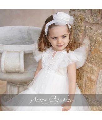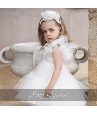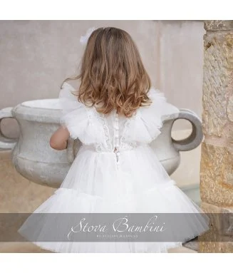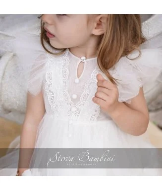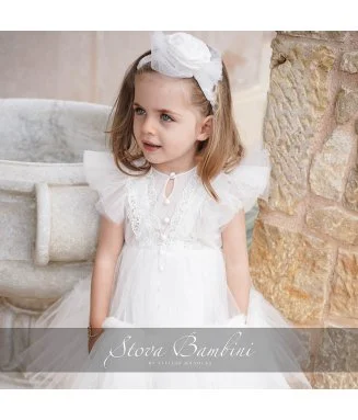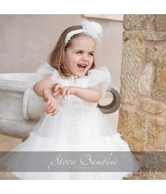 Premium SS25G28 by Stova Bambini Βαπτιστικό φόρεμα με βολάν σε off white απόχρωση (διατίθεται και στο χρώμα της πούδρας), από εξαιρετικό φίνο Γαλλικό τούλι, διακοσμημένο με γαλλική δαντέλα, από οργανικό βαμβάκι, στο μπούστο και βολάν στα μανίκια. Ιδιαίτερα ρομαντικό ύφος, έχει την ίδια όψη εμπρός και πίσω με διακοσμητικά κουμπιά που δεν χρησιμοποιούνται ως κουμπιά ανοίγματος του φορέματος αλλά ως ένα αξεσουάρ διακόσμησης, ενώ το ρούχο κουμπώνει με 5 κουμπάκια στην πλάτη